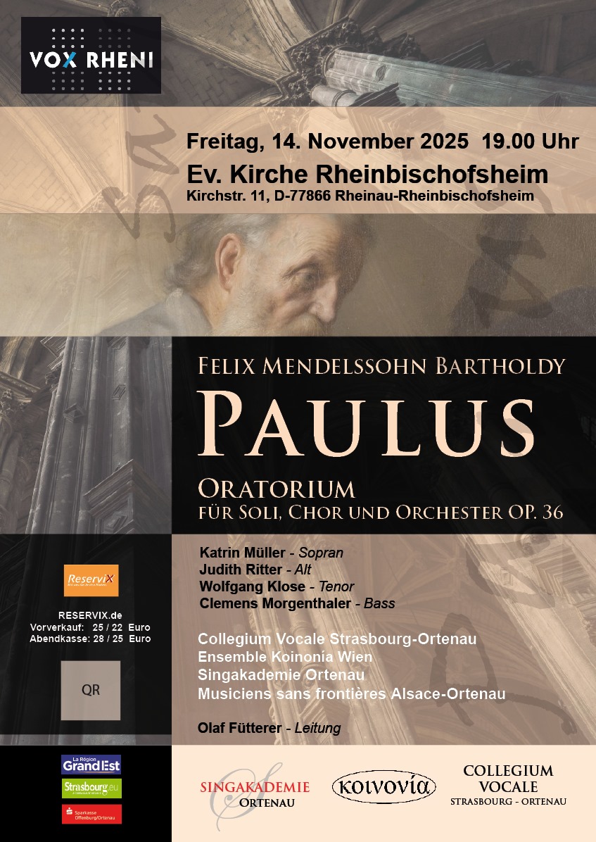 Am Freitag, den 14. November 2025 um 19:00 Uhr lädt die Singakademie Ortenau und das Collegium Vocale Strasbourg-Ortenau ein in die Evangelische Kirche Rheinbischofsheim – auch bekannt als der „Hanauer Dom“ – zu einem musikalischen Höhepunkt der Saison: